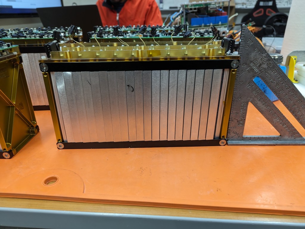 To give some more context, think of the segment like a sandwich, where the golden end plates are slices of bread, a Lithium-ion pouch cell stacked with a foam stuck on a thin aluminum sheet repeats twenty-one times to make up the filling. This sandwich is then compressed, and the black beams are added to ensure the filling does not fall out and the end plate stays in position.