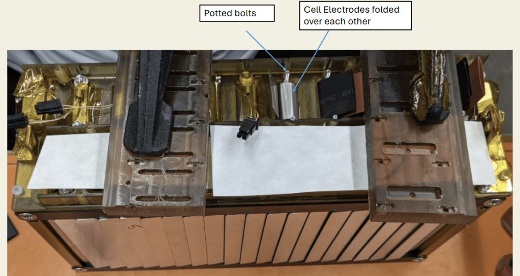 I was in the process of completing the cell connections and a bolt slipped through my fingers. For a split second, it contacted two electrode tabs causing a bright flash and a sharp bang, instantly biting out half the electrode. I had shorted my first cell which at this point was an annual tradition of our team. Sadly, this happened three more times over the entire assembly process. For both of these errors, we had to redo all the bolted connections, which brought another failure mode that no one anticipated.